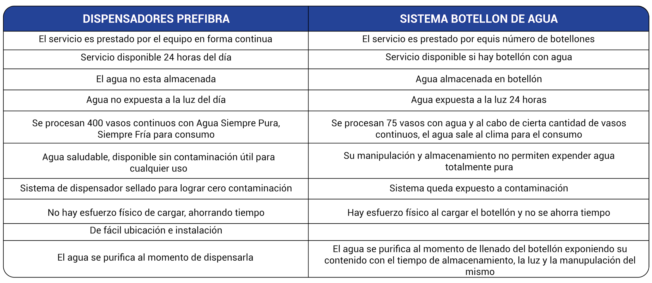 Agua siempre pura, siempre fria, pasando por un proceso de purificación al momento de dispensar cada vaso de agua.